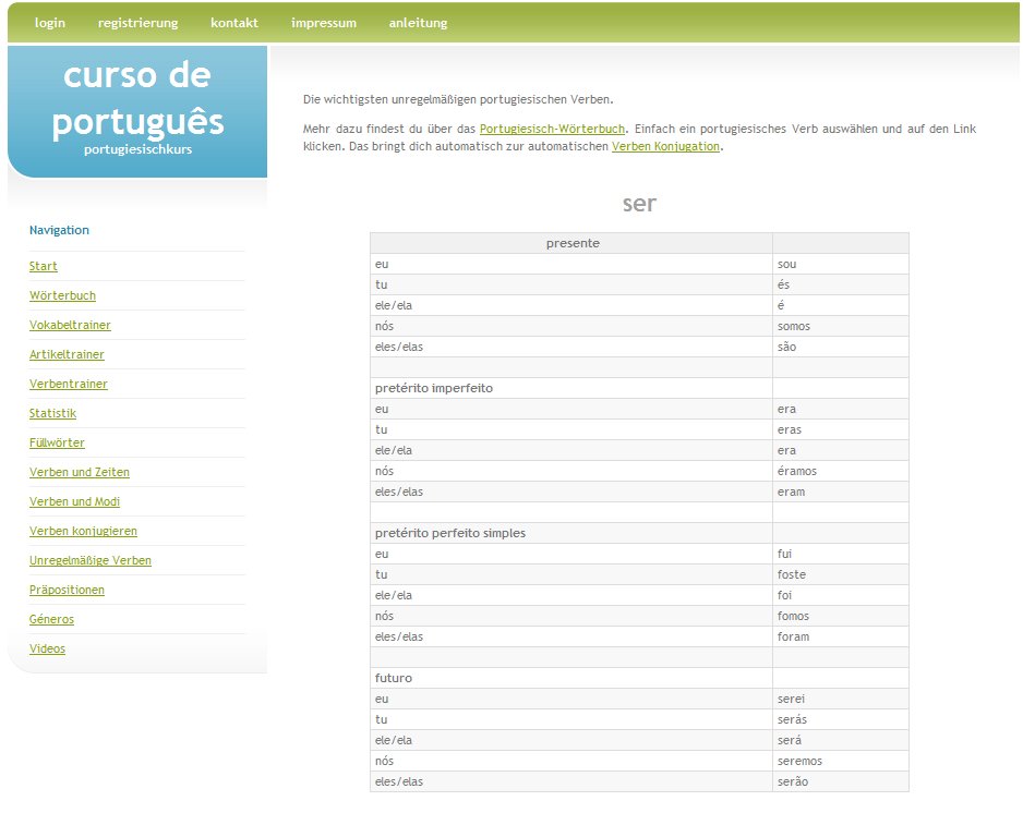 ... war das erste Element dieser Seite. Du kannst mit einem Klick auf einen Buchstaben alle deutschen oder portugiesischen Worte mit diesem Anfangsbuchstaben anzeigen lassen. Substantive haben in Klammern () das Geschlecht m oder f angegeben. Verben sind grün und unterstrichen - ein Klick auf das Verb bringt dich zur automatischen Konjugation.